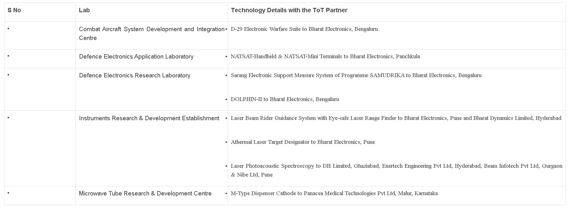 Additionally, the Sarang Electronic Support Measure System of Programme SAMUDRIKA and DOLPHIN-II, both from the Defence Electronics Research Laboratory, were transferred to BEL Bengaluru.