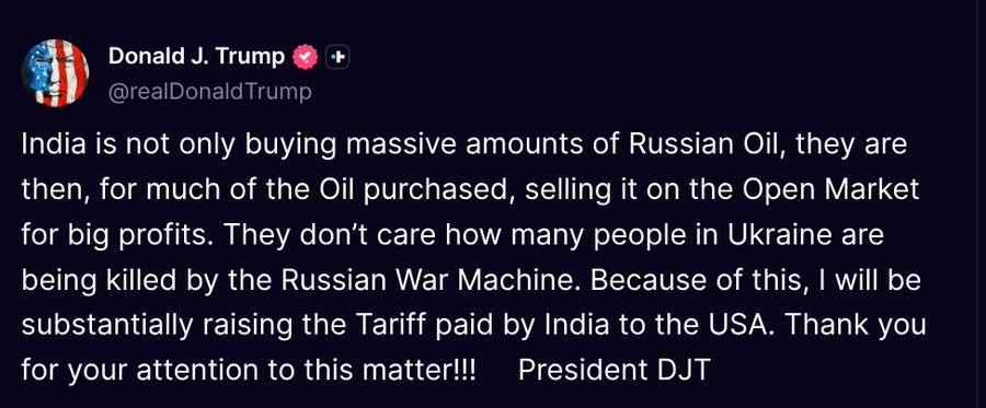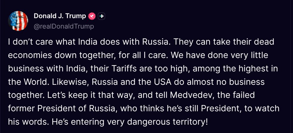 August 4 – “India is not only buying massive amounts of Russian Oil, they are then, for much of the Oil purchased, selling it on the Open Market for big profits. They don’t care how many people in Ukraine are being killed by the Russian War Machine. It is therefore extremely unfortunate that the US should choose to impose additional tariffs on India for actions that several other countries are also taking in their own national interest.”