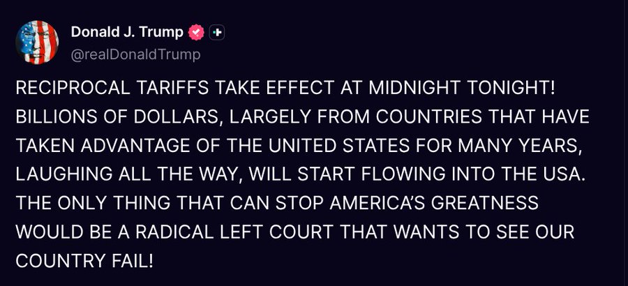 August 7 – “RECIPROCAL TARIFFS TAKE EFFECT AT MIDNIGHT TONIGHT! BILLIONS OF DOLLARS, LARGELY FROM COUNTRIES THAT HAVE TAKEN ADVANTAGE OF THE UNITED STATES FOR MANY YEARS, LAUGHING ALL THE WAY, WILL START FLOWING INTO THE USA. THE ONLY THING THAT CAN STOP AMERICA’S GREATNESS WOULD BE A RADICAL LEFT COURT THAT WANTS TO SEE OUR COUNTRY FAIL!”