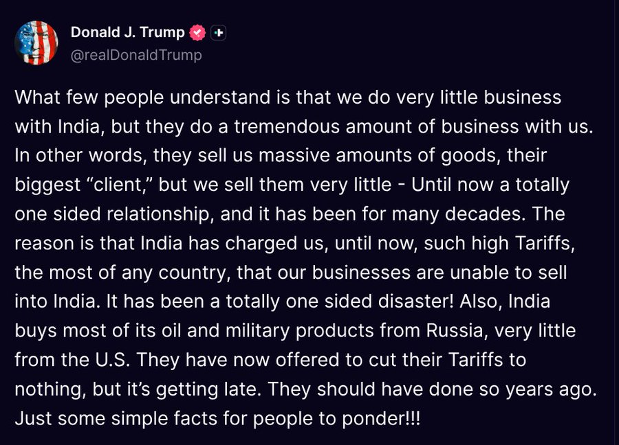 July 31 – “I don’t care what India does with Russia. They can take their dead economies down together, for all I care. We have done very little business with India, their Tariffs are too high, among the highest in the World.”