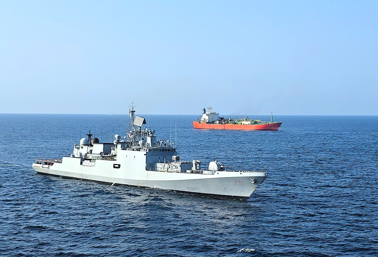 The crew of INS Trikand worked with a civilian tugboat hired by the shipping company to put out the blaze. Before the naval ship arrived, 24 of the 26 crew members had already escaped the burning tanker and were rescued by nearby merchant vessels.